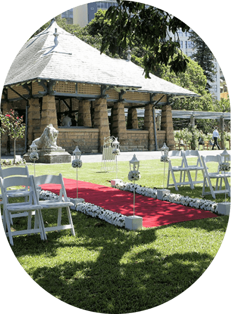 The majority of brides and grooms utilise the Rose Garden Lawn directly in front of the pavilion and run the wedding ceremony aisle south towards the rose garden pavilion with the Sydney Harbour Bridge in the background. The Rose Garden Pavilion & Lawn has heaps of space to add more padded white chairs to the wedding setup. With so much available space our 9m x 1.5m aisle runner is perfectly suited to the location. The length is especially important to ensure the space feels fully utilised.